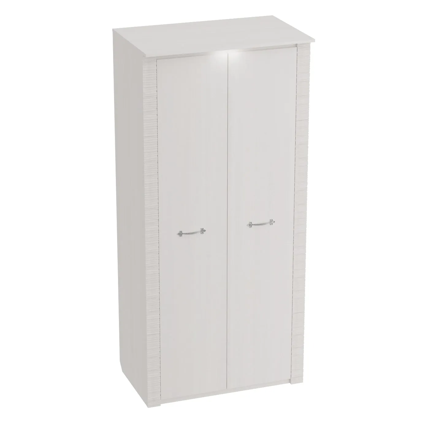 Двухдверный шкаф оснащен двумя отделениями: для белья с четырьмя съёмными и центральной жёсткой полкой; платяное с жесткой полкой и продольной стальной штангой. В колпаке шкафа имеется паз для светильника, входящего в комплект. Блок питания приобретается отдельно, и рассчитан на подключение шести светильников.